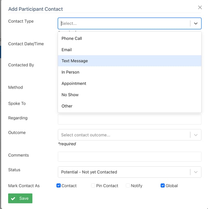 Once the Contact Type is no longer assigned to any participant records, it will automatically be removed from the Contact Type drop-down list for that study.