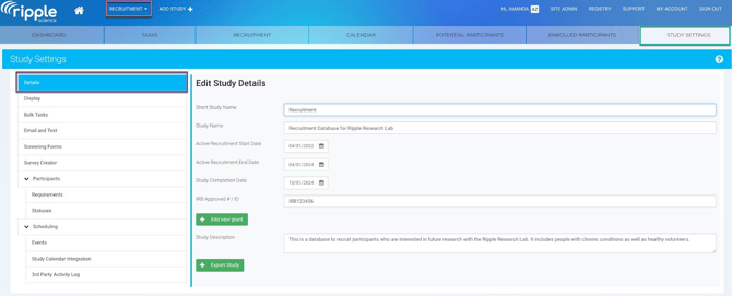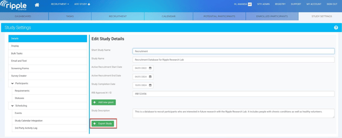 - All data should be exported prior to your Ripple subscription end date to ensure uninterrupted access to participant and study data. Once a subscription has ended, access to the site and its data may be limited or unavailable, which could prevent successful exports.